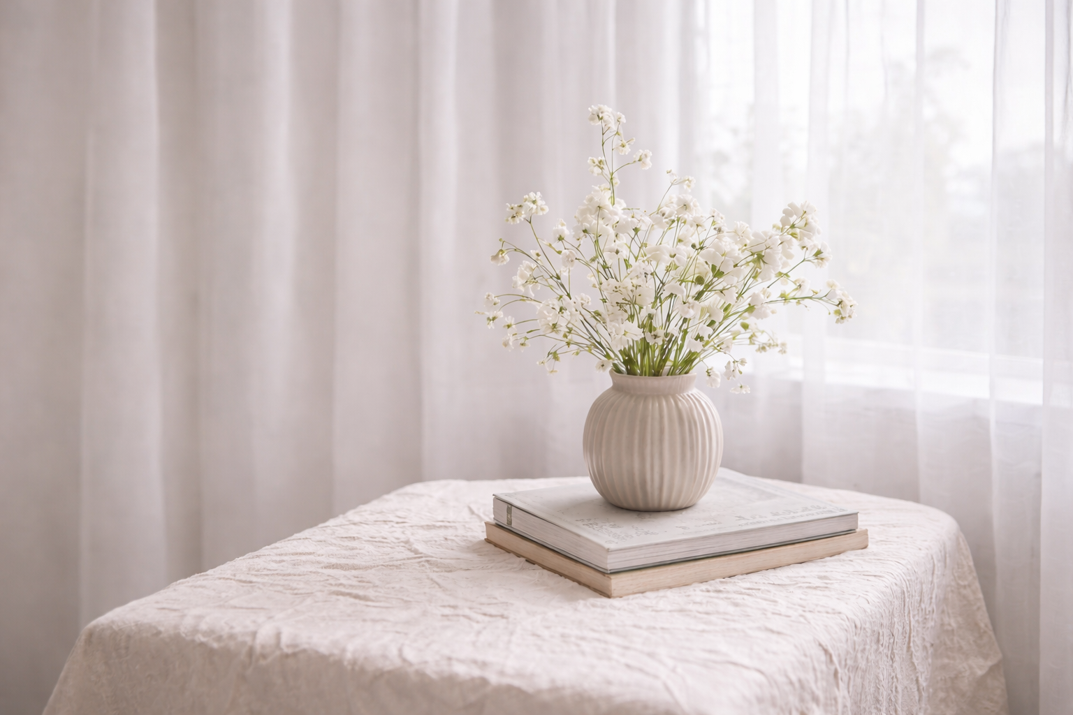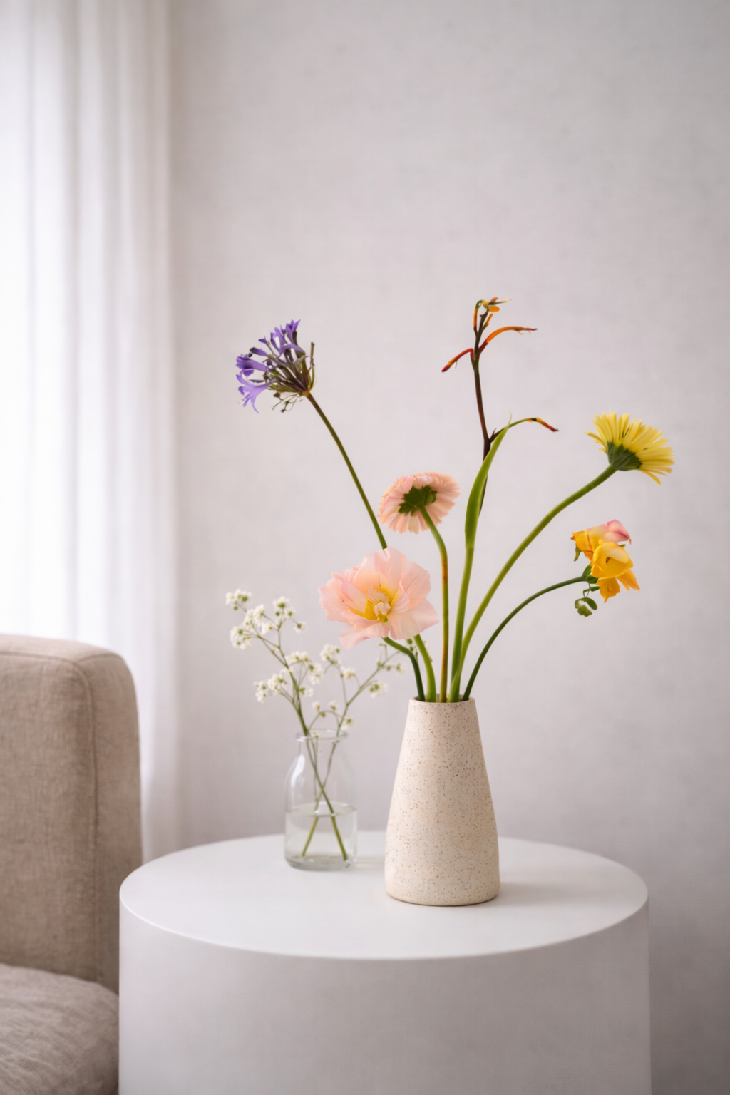 Composed flowers for entry tables, dining rooms, bedrooms, and quiet corners that need life without noise.